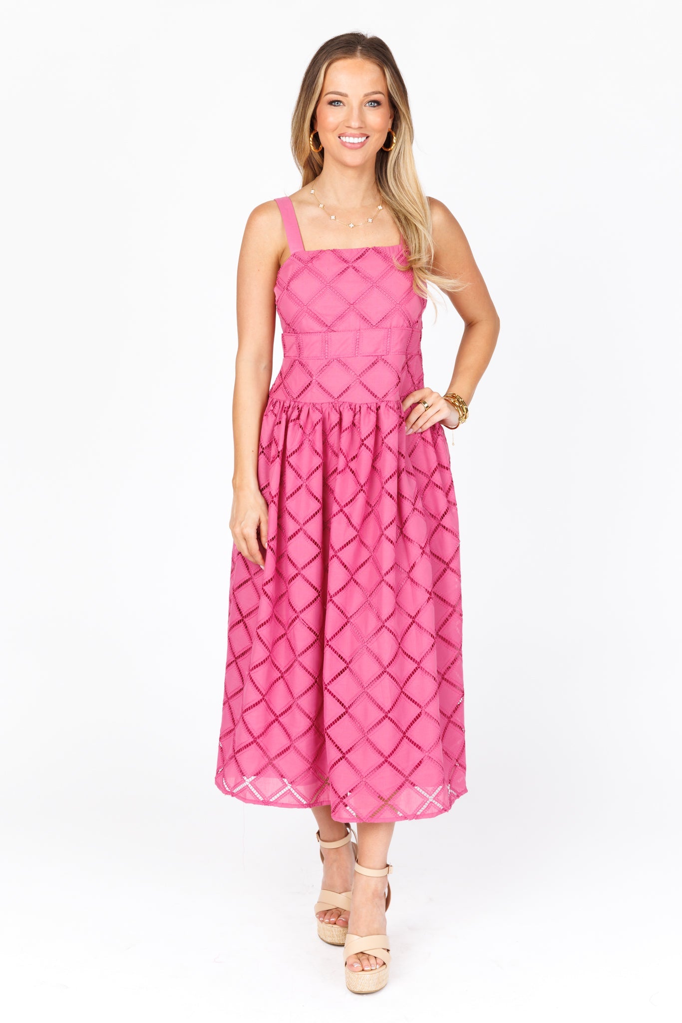 Cute and easy silhouette! We love the gorgeous shade of pink of our Adrianna Dress. This design features a beautiful lace overlay, midi length, thicker straps, and panels at the waist that create a flattering shape. Pair with this piece with heels or wedges for any upcoming events this Spring.