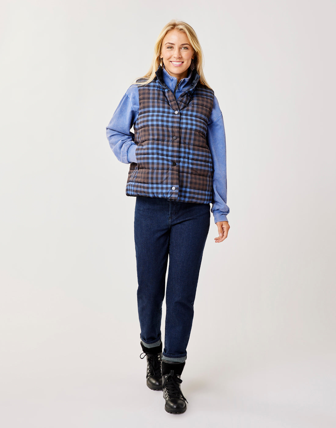 Indoors or out, the Baker Reversable Vest is a willing partner in lightweight but core warmth. Worn best over a sweater or your layer of choice. Sustainably filled, snap closure, and invisible zip on left pocket dial in the details.