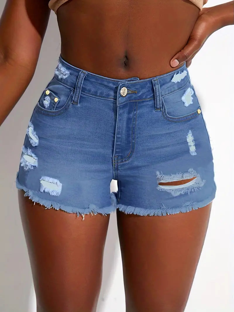 Blue Ripped Holes Denim Shorts, Slim Fit Slant Pockets Raw Hem Denim Shorts, Women's Denim Jeans & Clothing
