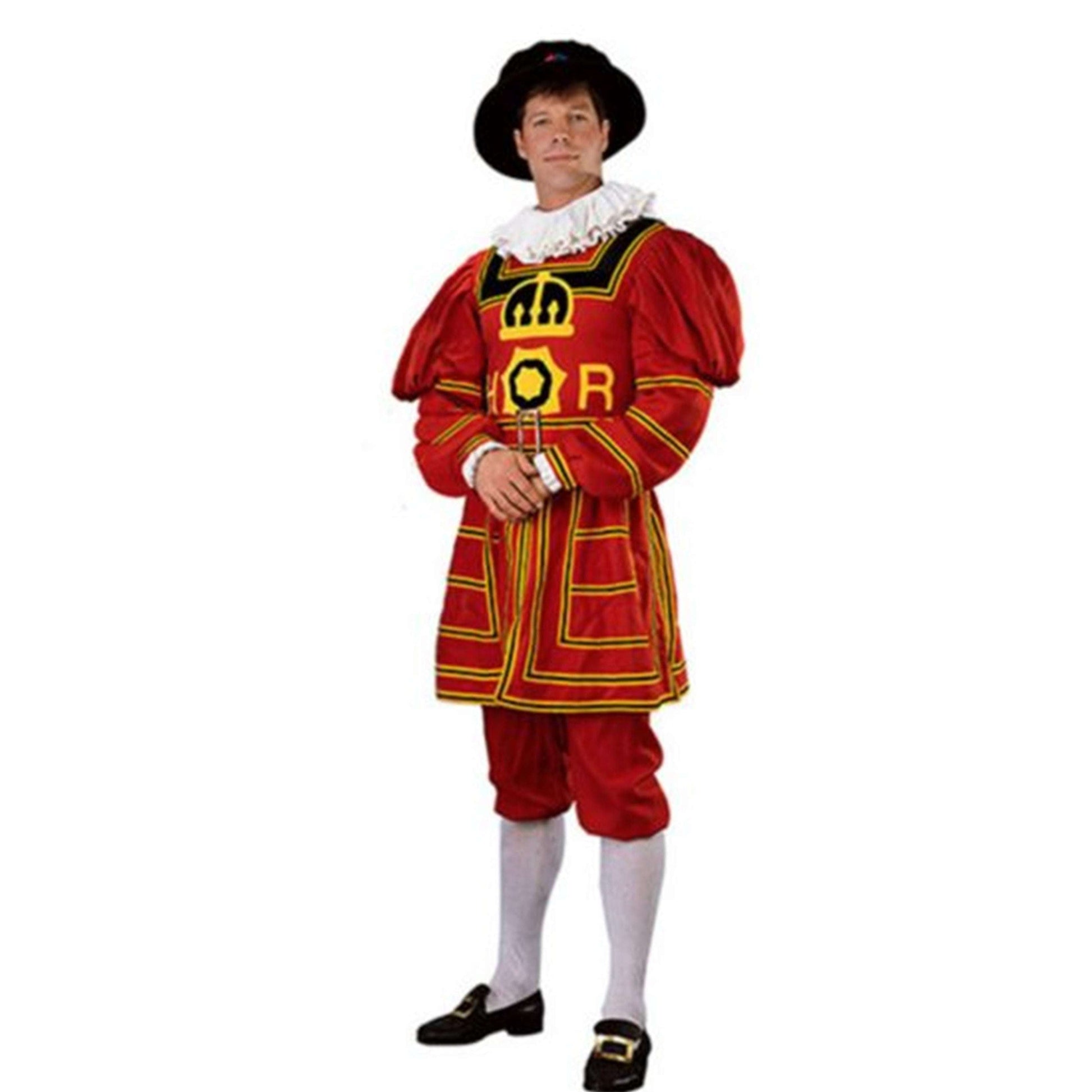 Step into the role of a British Beefeater with this lustrously authentic costume. From sizes small through large, this high quality ensemble is perfect for making a powerful entrance that commands attention. Ready to be your Majesty's loyal guard?