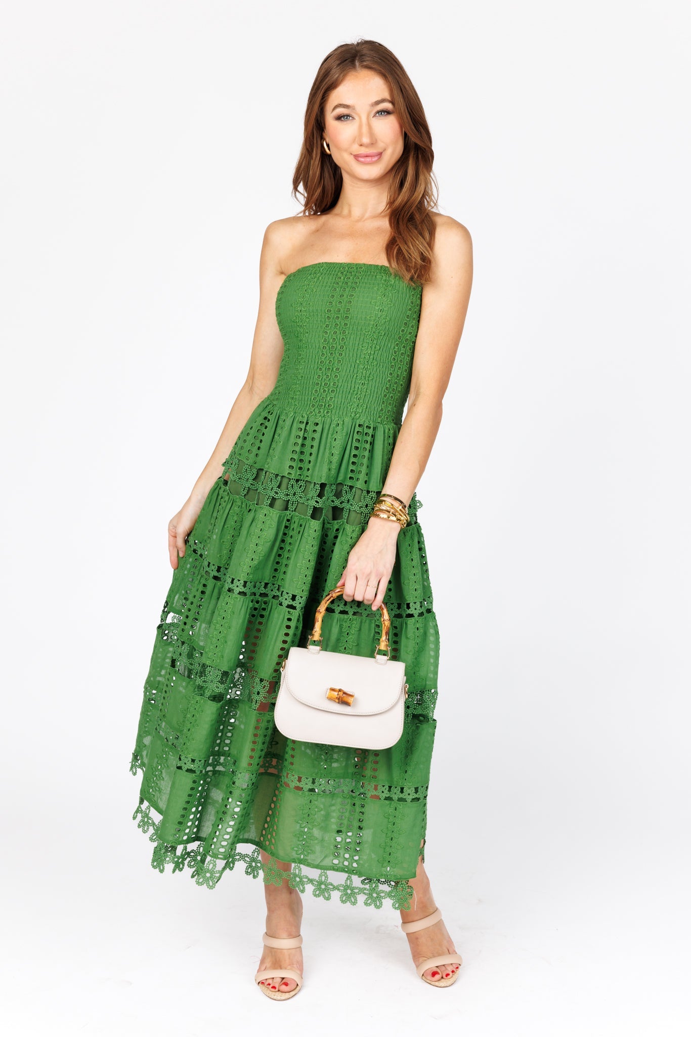 Easy, breezy! Our Cecilia Dress features a fun strapless silhouette that is perfect to throw-on-and-go! We just love the smocked bodice and lace overlay design on this midi. This piece is partially lined, so you get a cute peek-a-boo effect on the bottom half of the skirt. Wear with heels to dress it up or keep it casual with flat sandals.