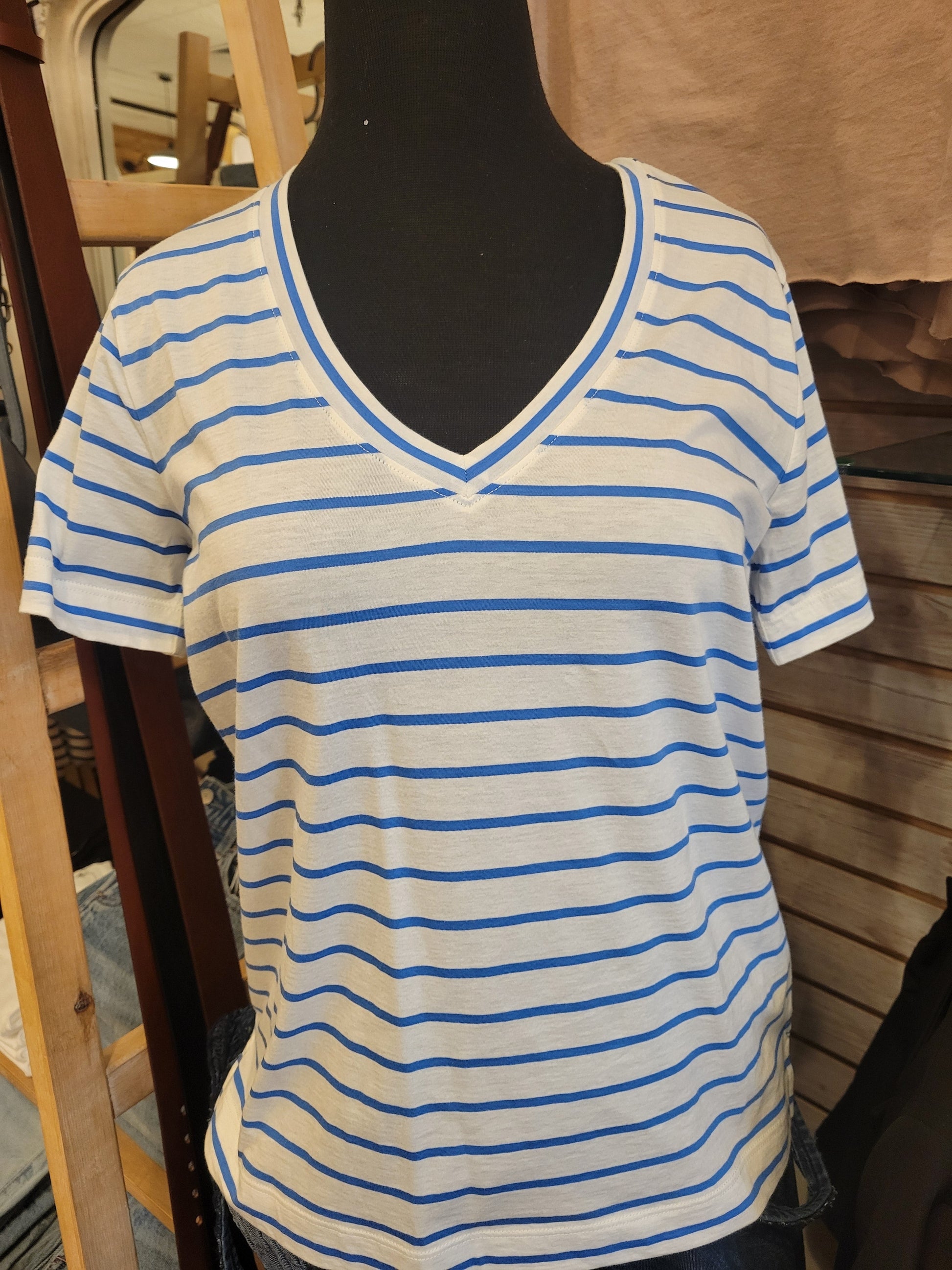Introducing the Clean Jersey V-Neck Tee in White, a must-have for sophisticated wardrobes. This striped tee boasts a stylish v-neck, perfect for warmer weather. Its breathable fabric will keep you cool and comfortable while looking effortlessly fashionable. Elevate your style with this elegant and versatile piece.