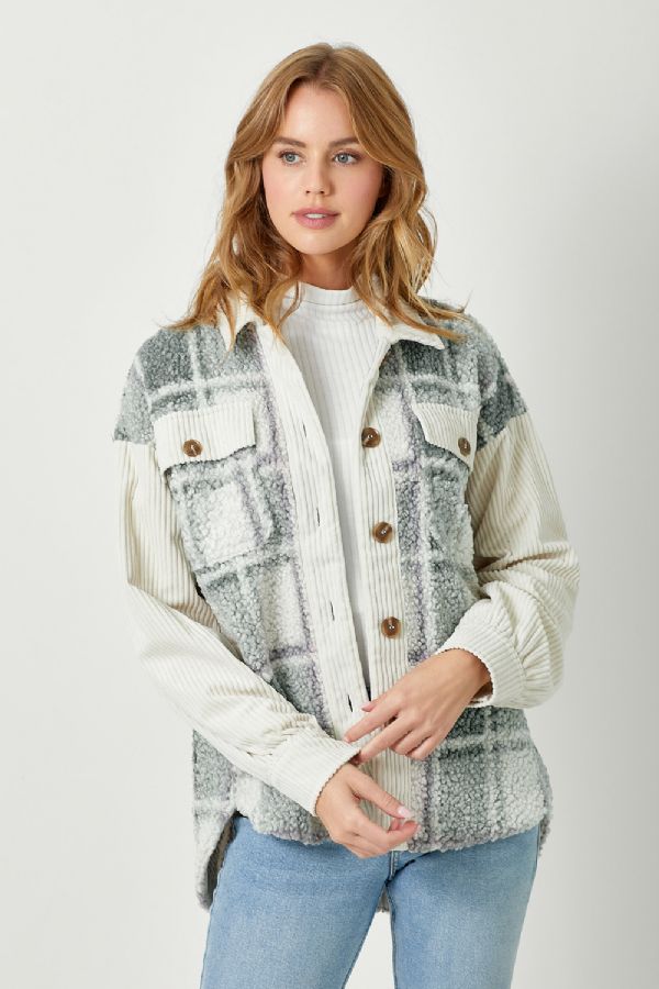 Experience opulence and distinction in the Corey Jacket. Crafted in a classic plaid print with luxuriant fur detailing, this jacket features a button-down closure and bust pockets for a timeless silhouette. Corduroy sleeves and detailing create a refined design, while a hi-lo hem adds a touch of modern sophistication. Elevate any wardrobe with this exclusive piece.