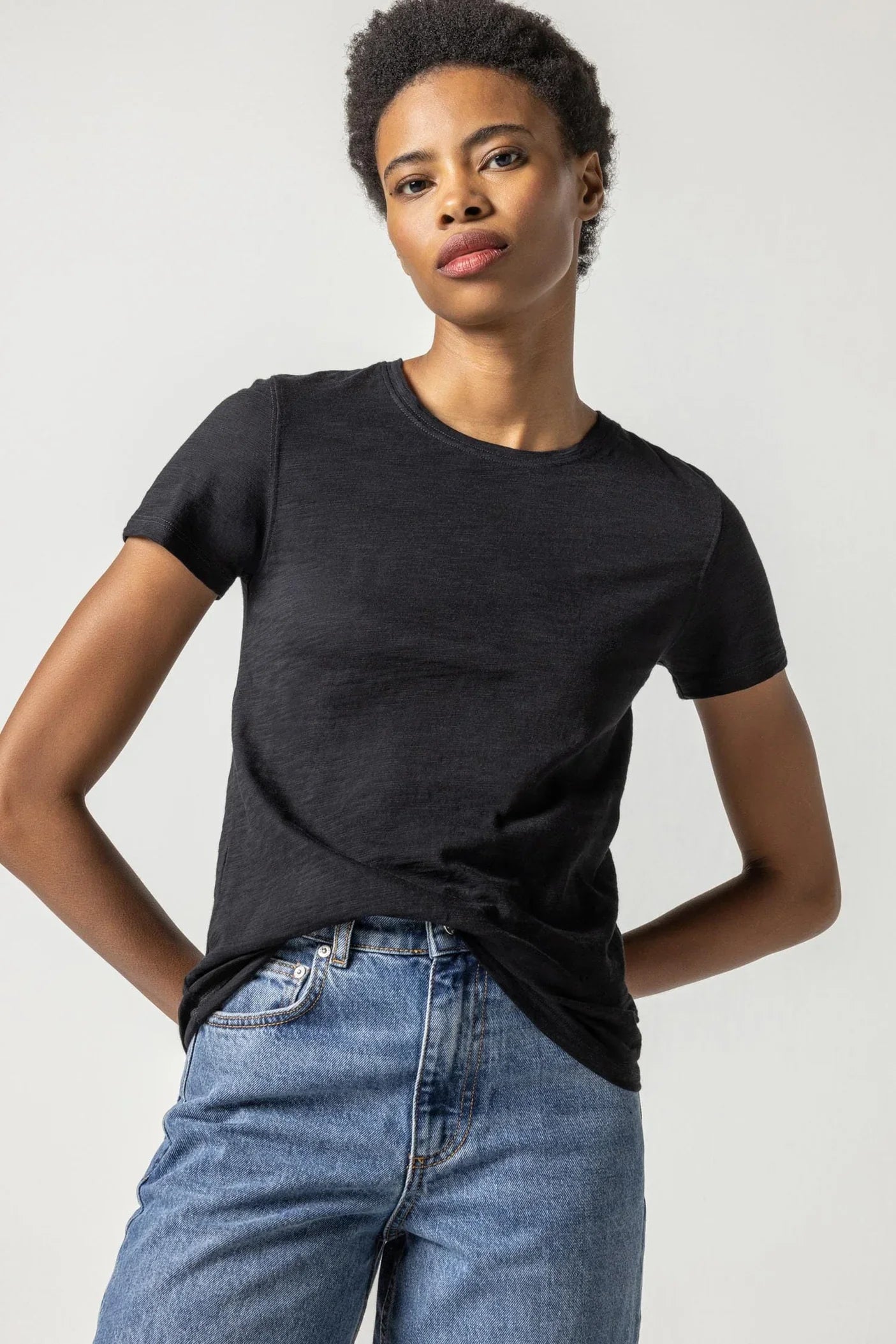 Embrace the essence of simplicity with the Crew Neck Back Seam Tee in Black. Made from loose-knit cotton slub fabric, this short sleeve slub tee offers both comfort and style. The back seam detail adds a subtle touch of dimension, making this tee an elevated must-have in your collection. Whether you wear it on its own or layer it under your favorite jacket or cardigan, this tee is incredibly versatile.