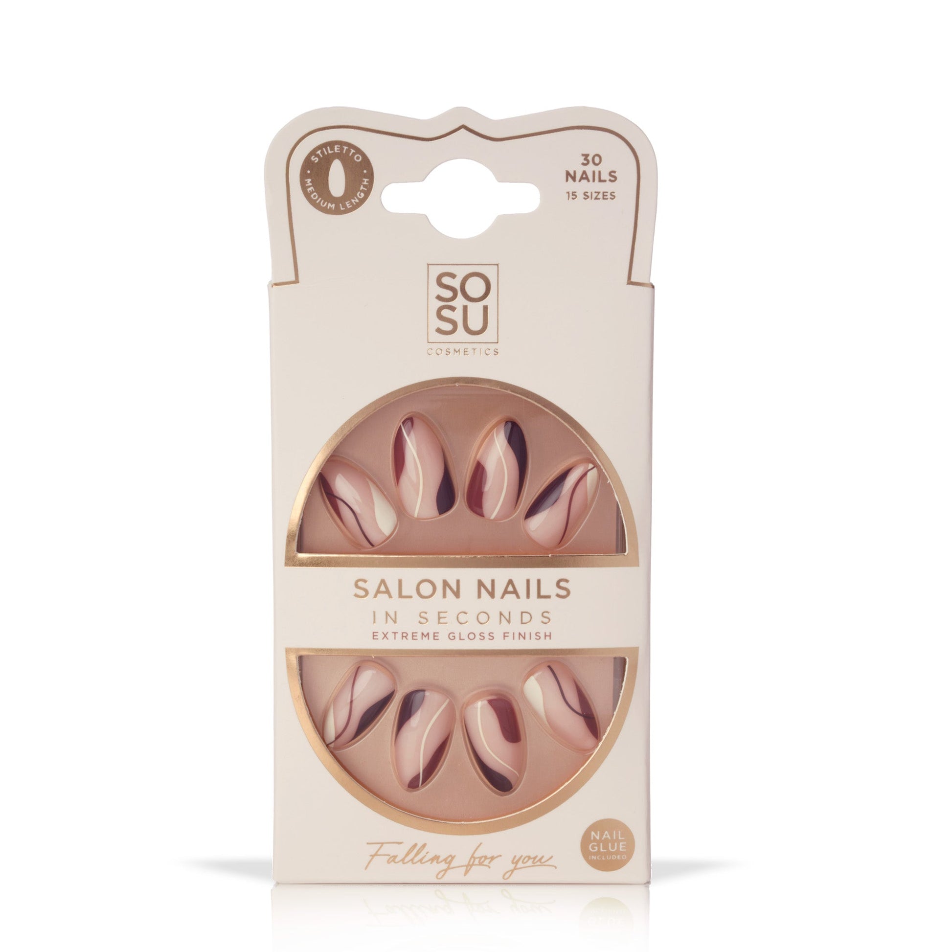 Our Falling For You faux nails will give you a stunning manicure in seconds. A stunning stiletto-shaped, medium-length manicure with a mix of chocolate-tone accents to create your own signature look. The stiletto shape instantly slenderises your fingers with slim sides that meet with a rounded point and a tapered curved tip. With our 15-size options, achieve on-trend salon results at home in seconds.