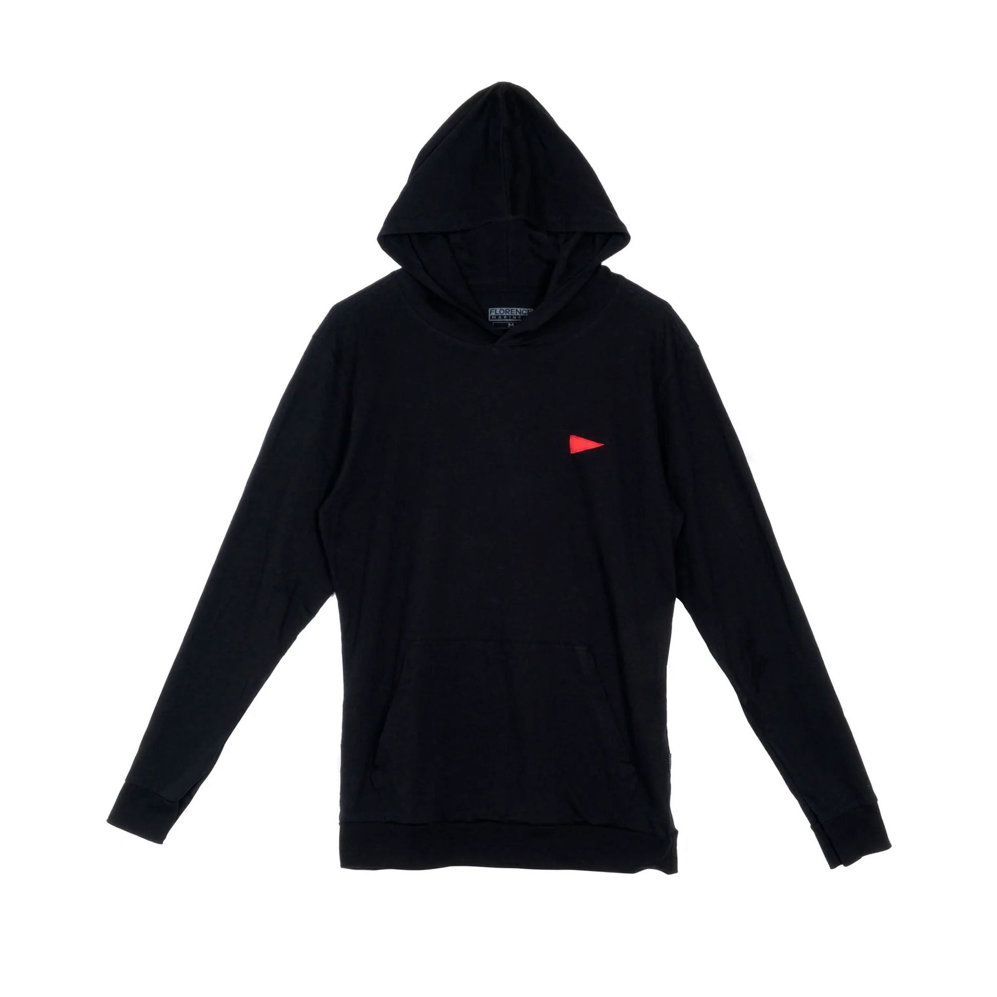 The Florence Marine X Burgee Men's L/S Hooded Shirt. The Florence Burgee Hooded Long Sleeve T-Shirt features our red burgee flag embroidered on the left chest. Made from 100% cotton for breathable everyday wear, while the attached hood provides portable shade during long hours in the sun.