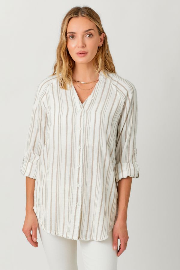 The Frankie Top elevates your wardrobe with its double cloth fray bottom and sophisticated vertical stripes. Its button down design and long sleeves with button tabs exude timeless elegance. The V-neckline and hi-lo hem add unique touches to this luxurious piece.