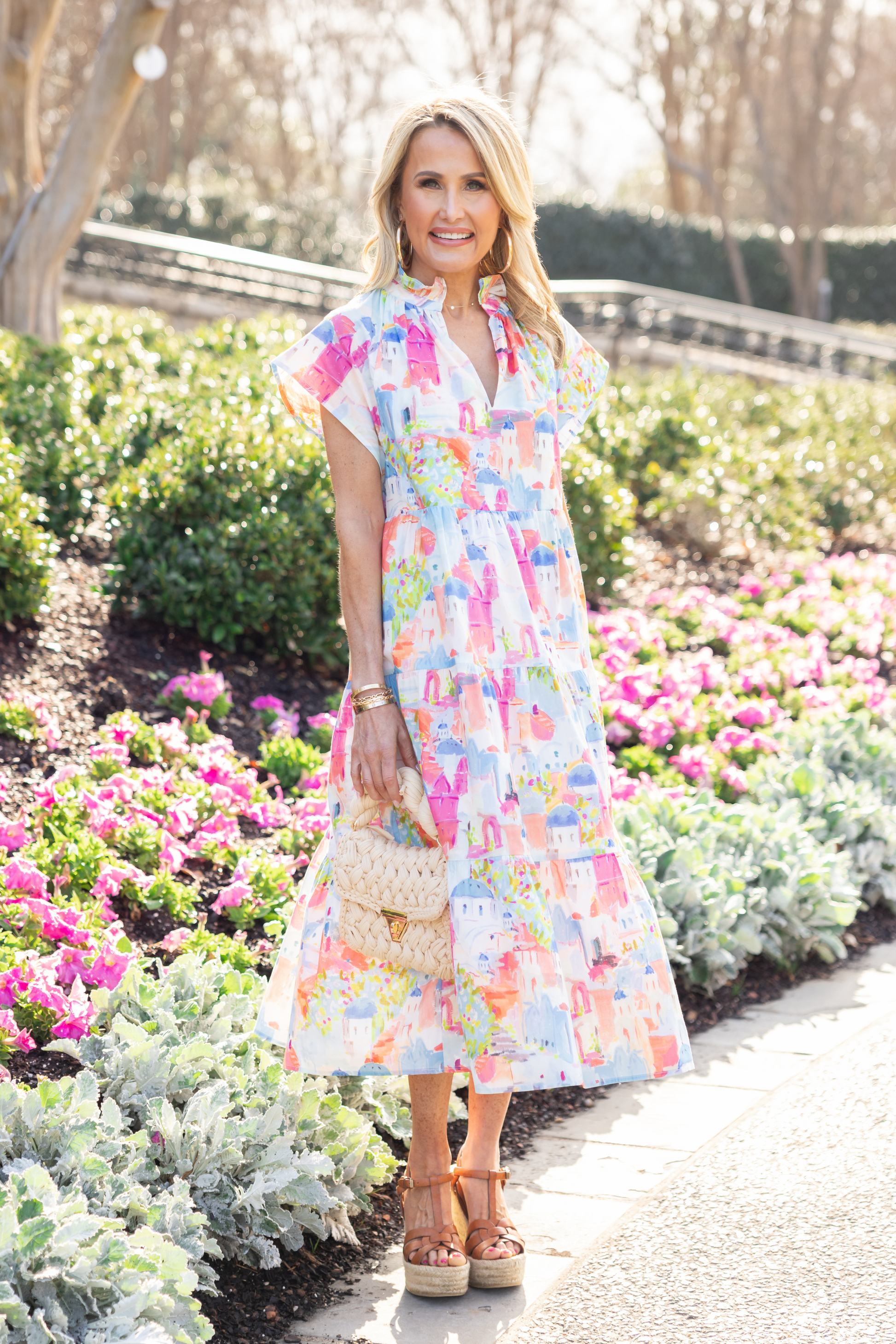 A MUST HAVE, available in extended sizing! Our Isa Dress could be one of our favorite Avara Exclusives yet, with a silhouette inspired by designer pieces that retail for $300+. Featuring a high-quality poplin cotton fabrication, stand collar and split neckline, this tiered ruffle midi is chic and oh so flattering. The watercolor print, inspired by the island of Santorini, is elevated and unique. A gorgeous option for Spring, this piece is cool and comfortable enough to wear everyday with flat sandals or elevate the look with your favorite wedges and a tote. Whether it's brunch with the girls or wearing to sightsee on that upcoming vacation, this piece is sure to bring the compliments!
