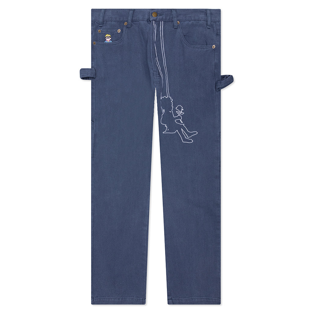 Upgrade your denim rotation with the KidSuper Swingset Pant. Featuring a cotton construction, the pants take on a signature five-pocket design in addition to reinforced belt loops. A zip and button fly is placed, while an embroidered superhero character makes an impression at the front. The welted leg pockets and embroidered swingset graphic wraps up the rest of the design.