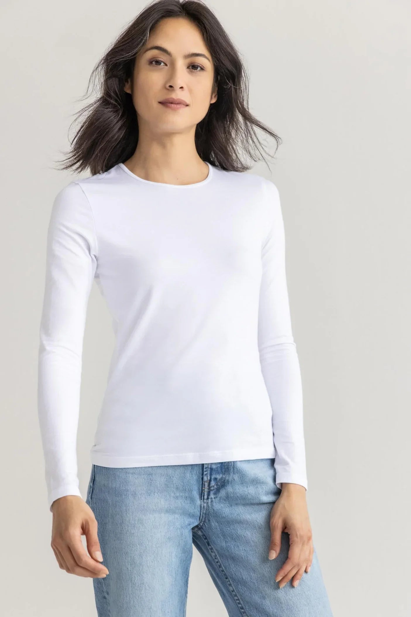 Layering staples have been updated and are better than ever! Beautiful Pima cotton and a touch of spandex create the perfect fit for the Long Sleeve Crew Tee. With narrow trims, this tee is clean and simple and layers beautiful under any fabric.