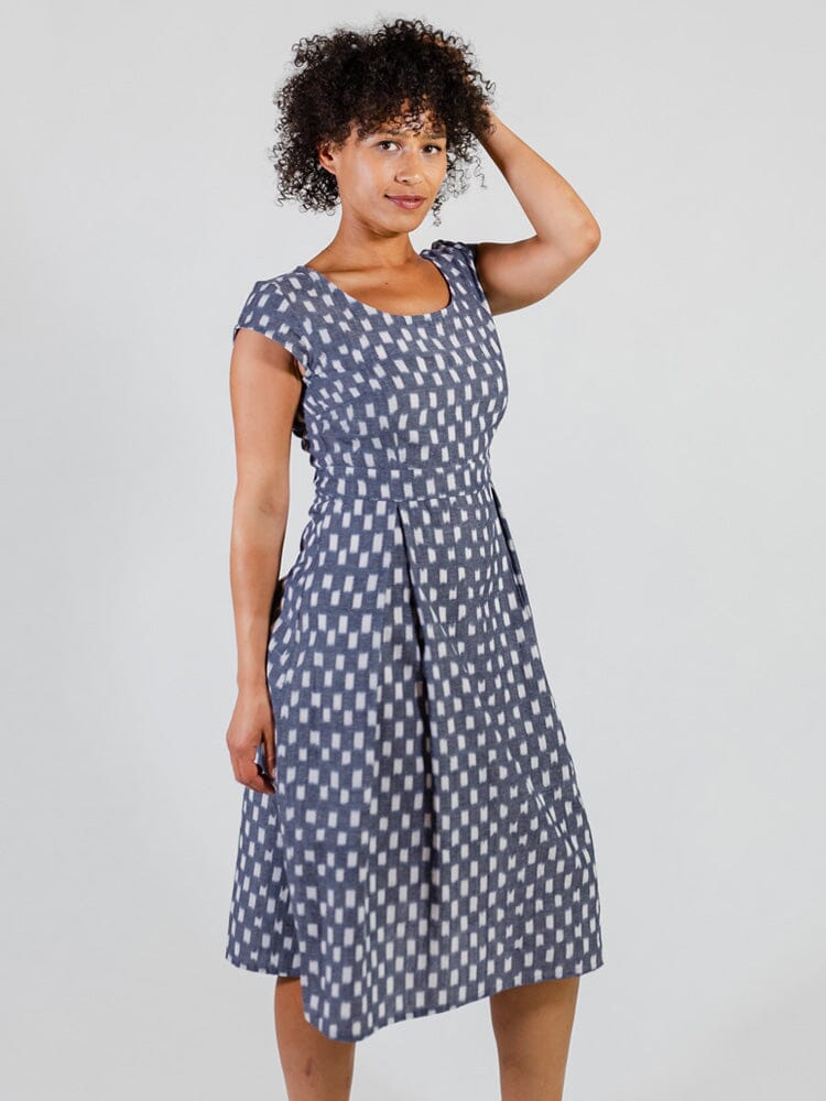 Creating this fit and flare dress involves the extensive artisanal process of hand crafted ikat. Yarn is tied and dyed, dried, and later woven into this beautiful blue and white pattern! Put a polished pep in your step with goldtone jewelry and ankle boots.