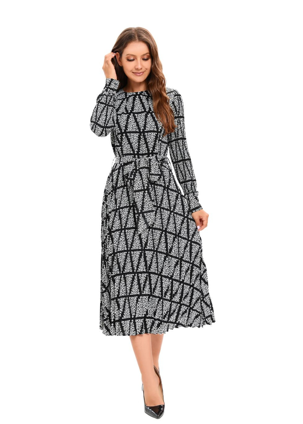 Elevate your style with the Monochrome Grace Midi Dress. Featuring a striking black background adorned with white triangles, this lightweight dress promises a flattering fit. The self-tie belt cinches the waist, while its long sleeves and collarless design add a touch of modern simplicity. Perfect for day-to-night elegance.