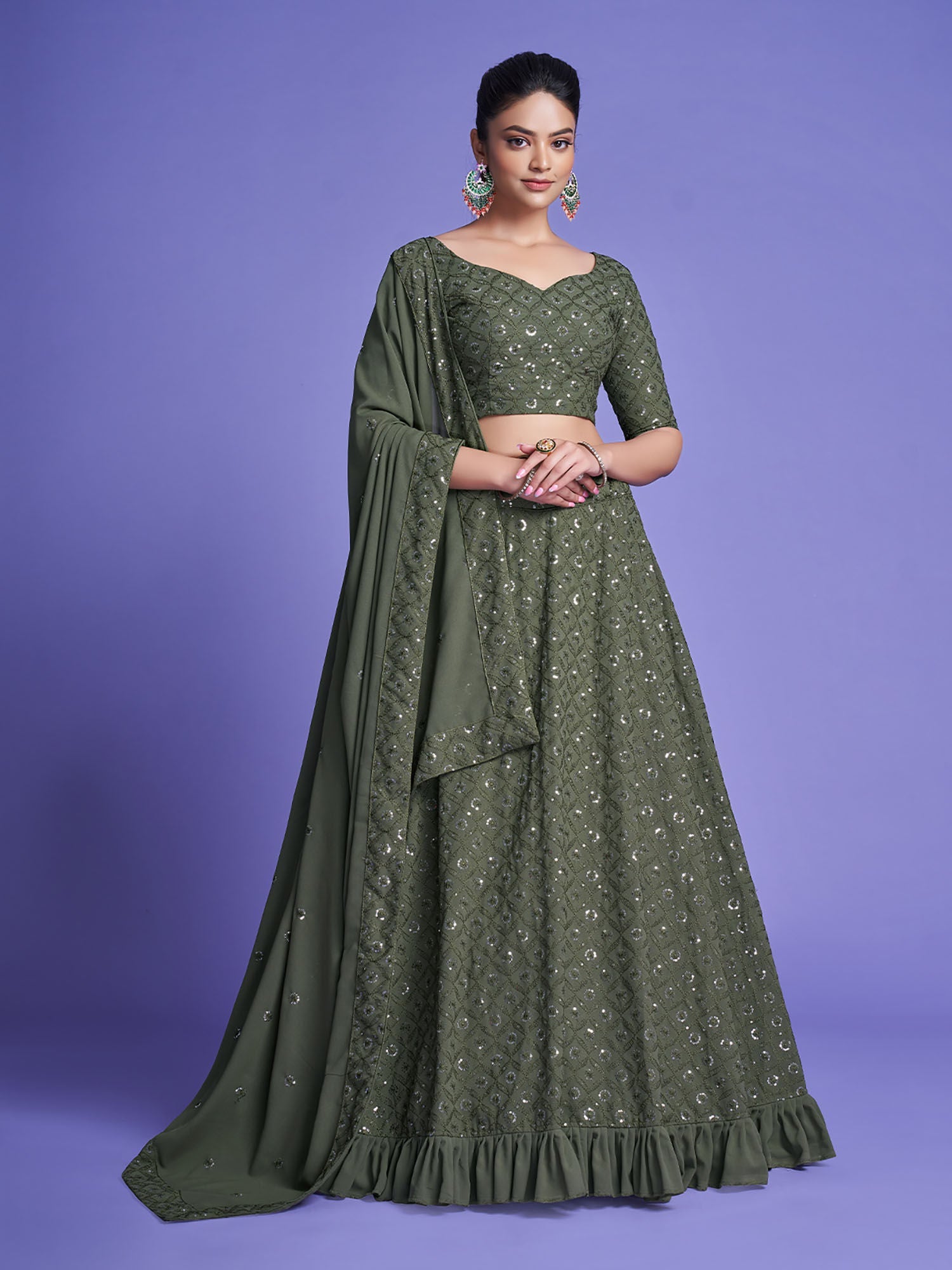 Odette Olive Embroidered Semi Stitched Lehenga With Unstitched Blouse And Dupatta (Set of 3)
