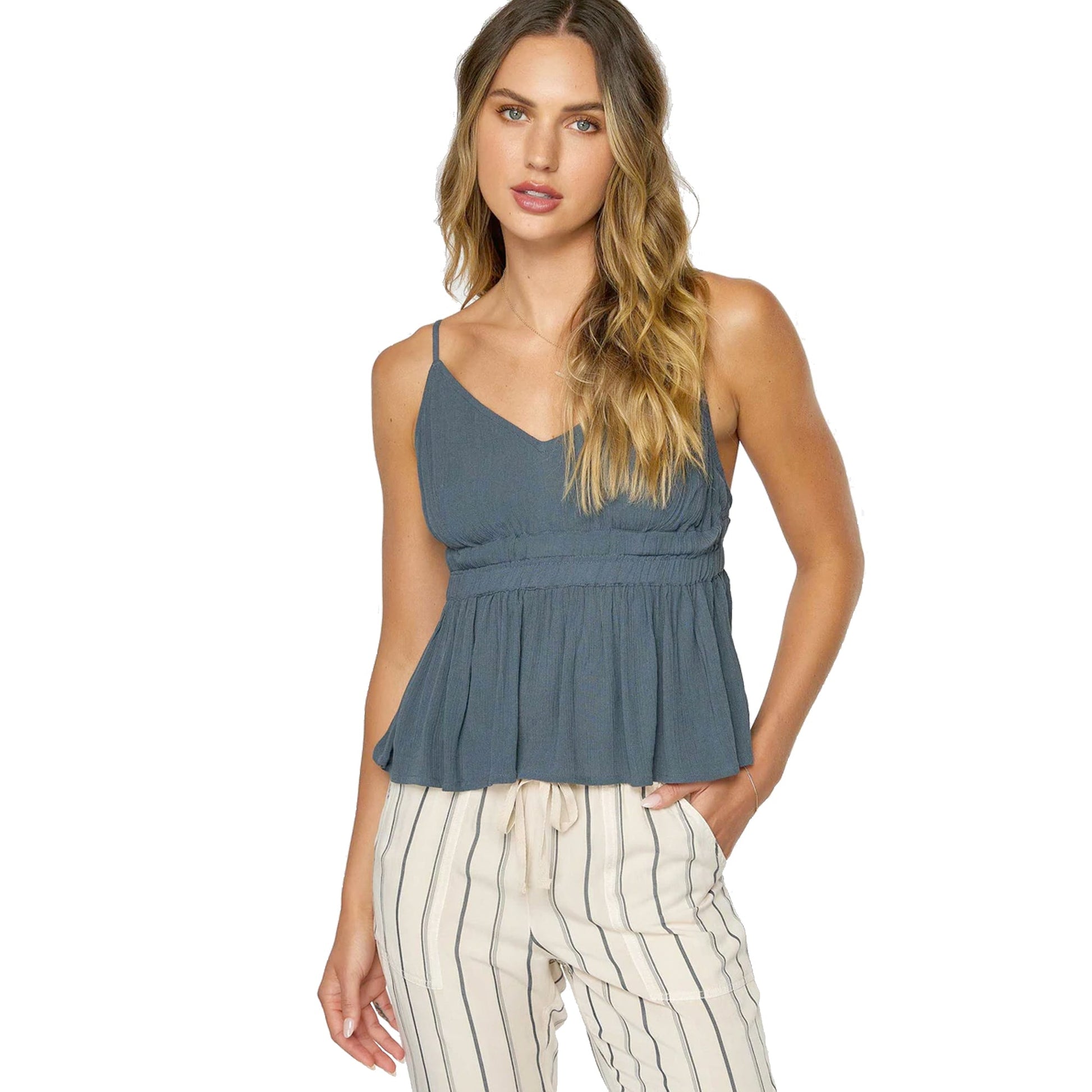 The O'Neill Kelby Women's Tank Top is a woven tank top that has a thin, over-the-shoulder strap design and textured waist detail.