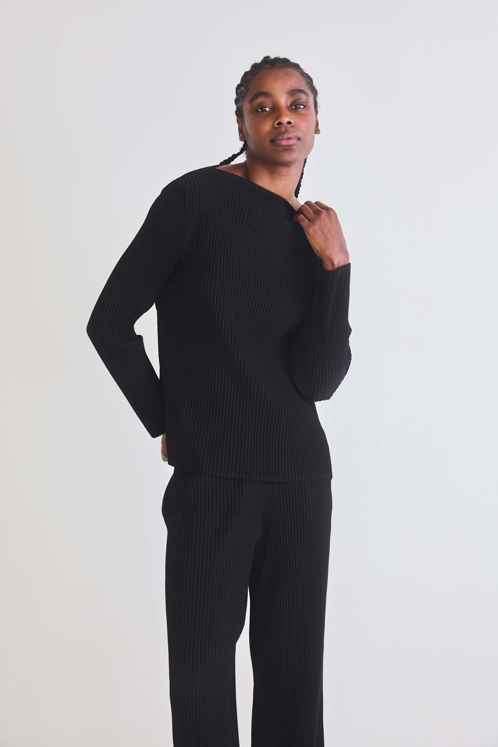 Designed for the modern muse, this top effortlessly transitions from day to night, making it a versatile choice for various occasions. Whether paired with the Masterful Plisse Pleated Pants for a chic and effortless look, its timeless appeal adds a touch of sophistication to every outfit.
