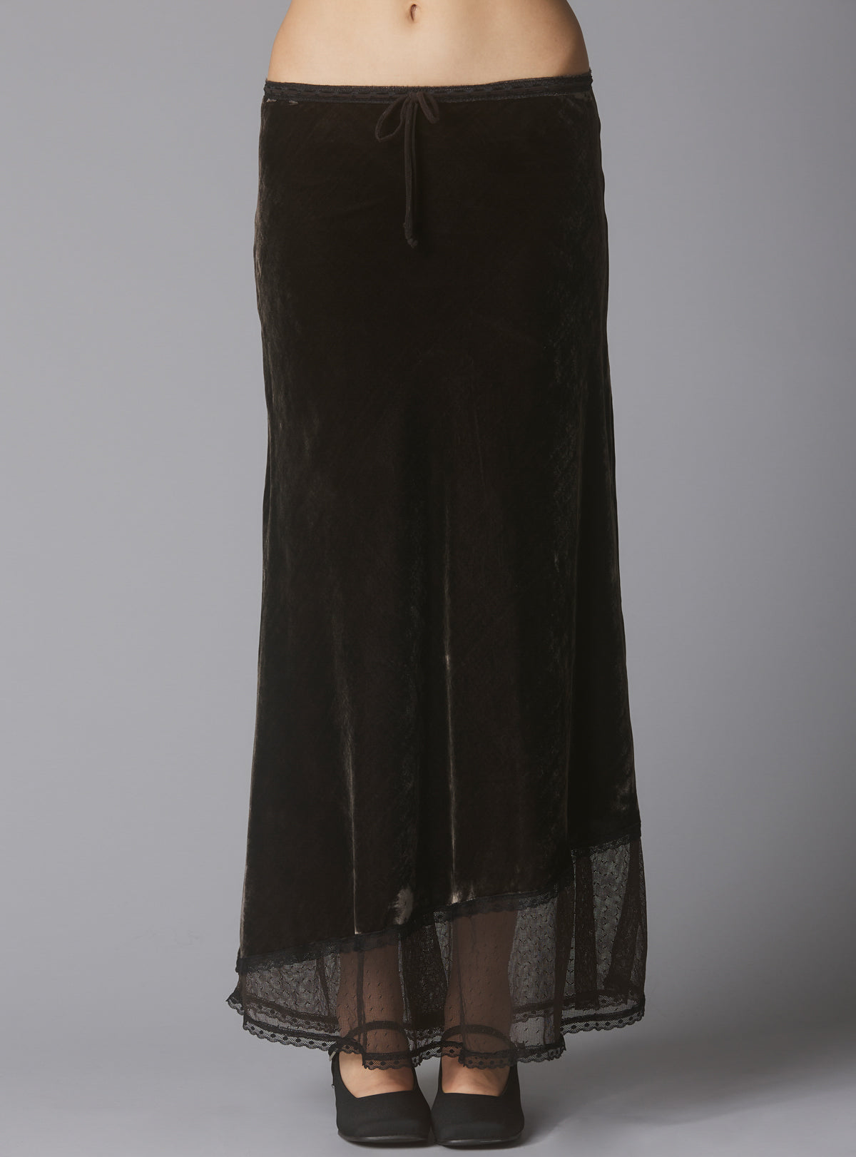 Velvet maxi skirt with asymmetrical lace trim at the bottom. Has a tie closure with lace facing at the waistband