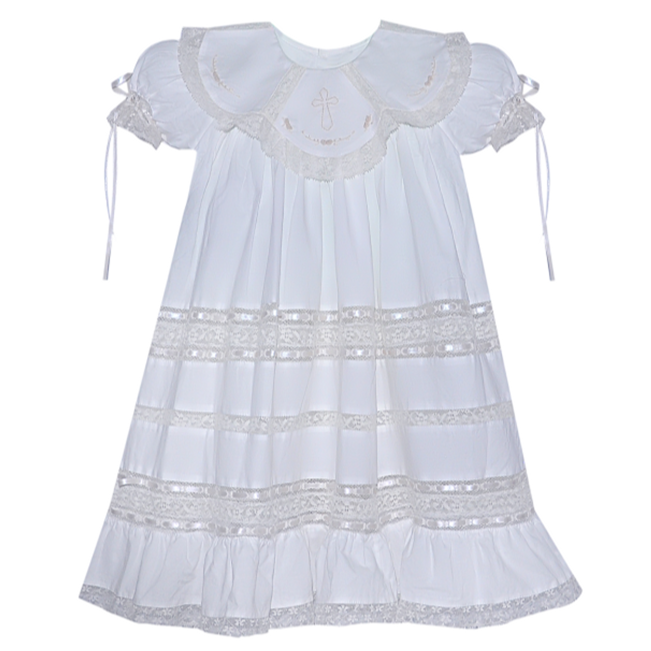The stunning detail on our Faustina Dress will take your breath away! Perfect for her first communion, the gorgeous vintage white dress with ecru color French lace inlays and hand-stitched cross with nude rosettes on the scalloped collar are perfection. Adorned with silk ribbon throughout, this dress will be one for the keepsake box.