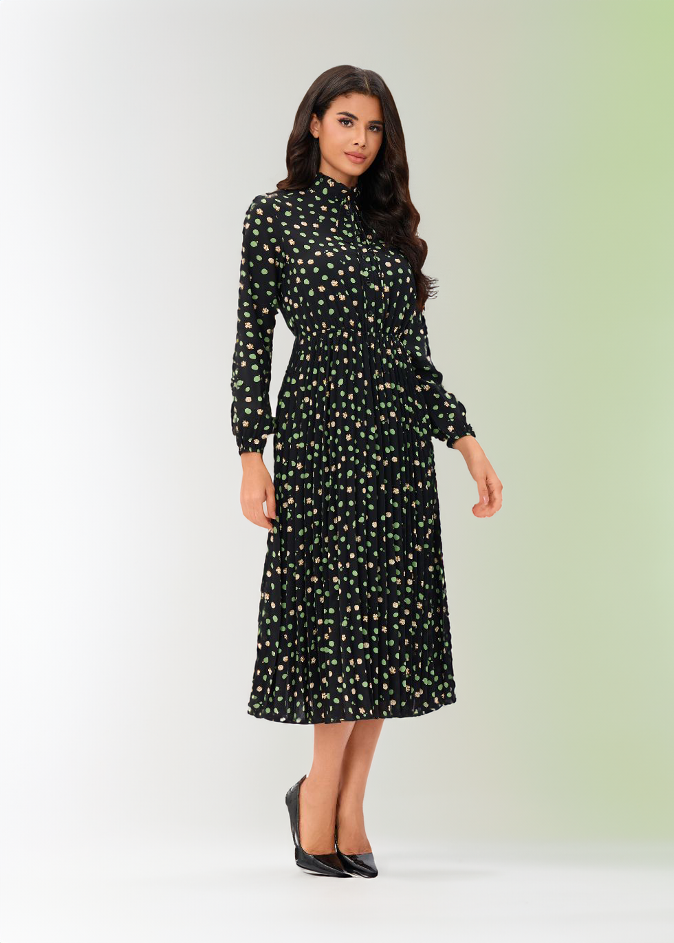 Introducing the "Green Foliage Midi Dress," a perfect piece for nature lovers. Adorned with a leafy print, this dress celebrates the vibrancy of nature with its green hues. Stretching 49.5 inches from the high point of the shoulder, it's designed to flatter your figure. With a stylish button-down front and an elastic waist for comfortable fitting, it's fully lined except for the sleeves, adding an air of sophistication.