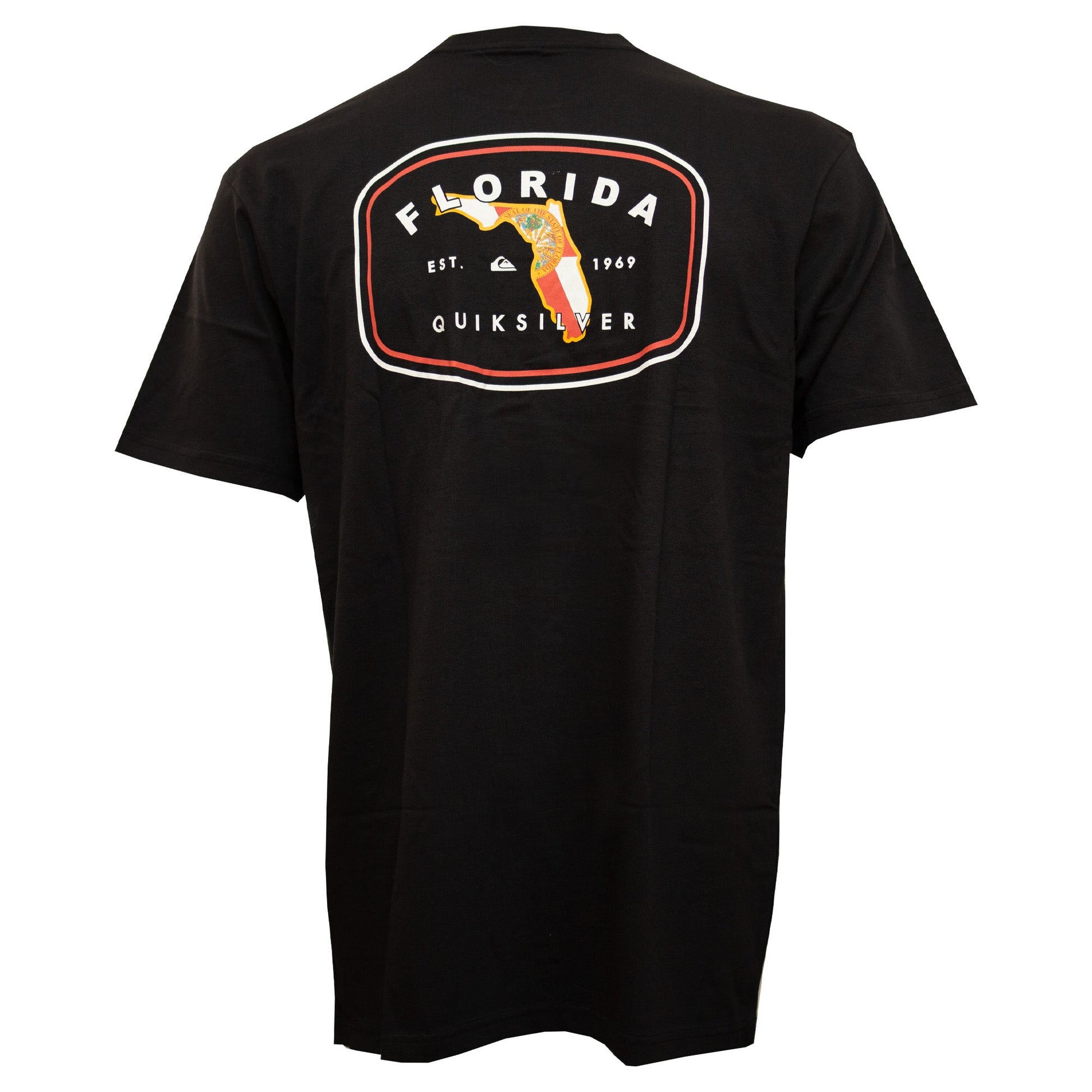 The Quiksilver FL State Of Mind Men's S/S T-Shirt features a custom Quiksilver Florida shaped flag logo on the front and back, a crew neckline, and a comfortable regular fit. Made from 100% cotton.