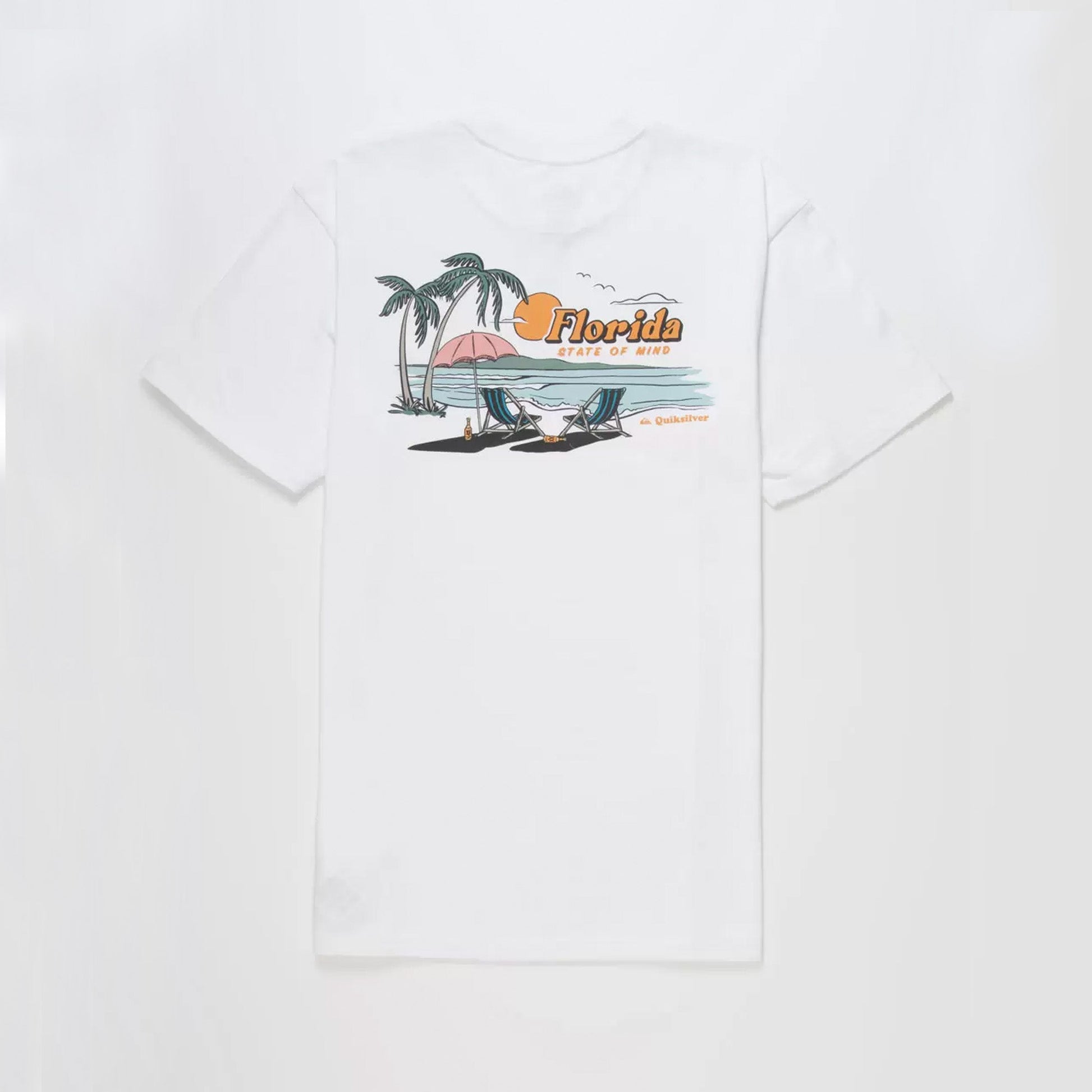 The Quiksilver FL State Of Mind Men's S/S T-Shirt features a smaller graphic on left chest area and a large graphic on back. Crew neck and super soft, this tee is made of 100% cotton.