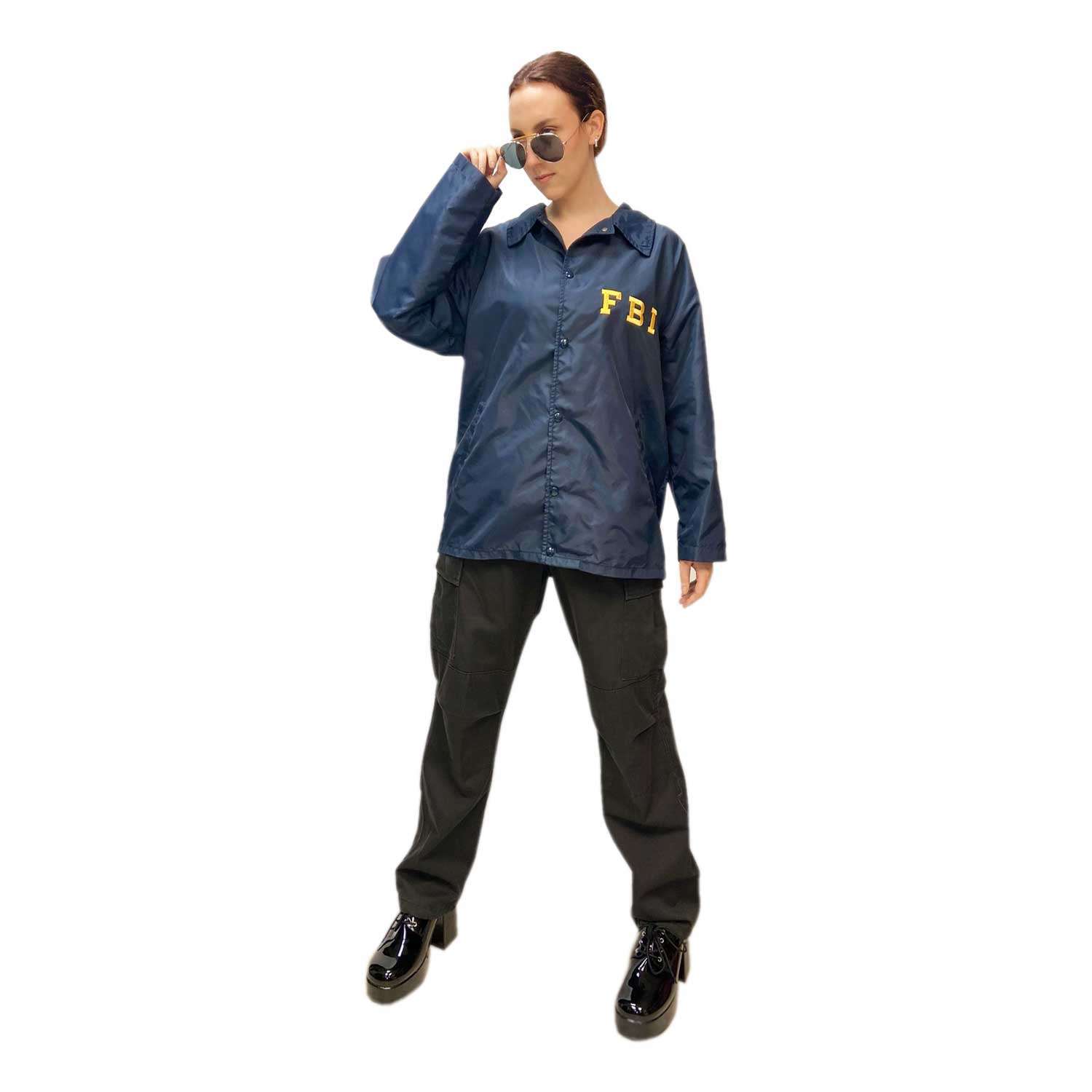 - Includes navy blue jacket with embroidered FBI logo on front and back, metal badge, pants, hat with badge and additional police accessories available upon request.