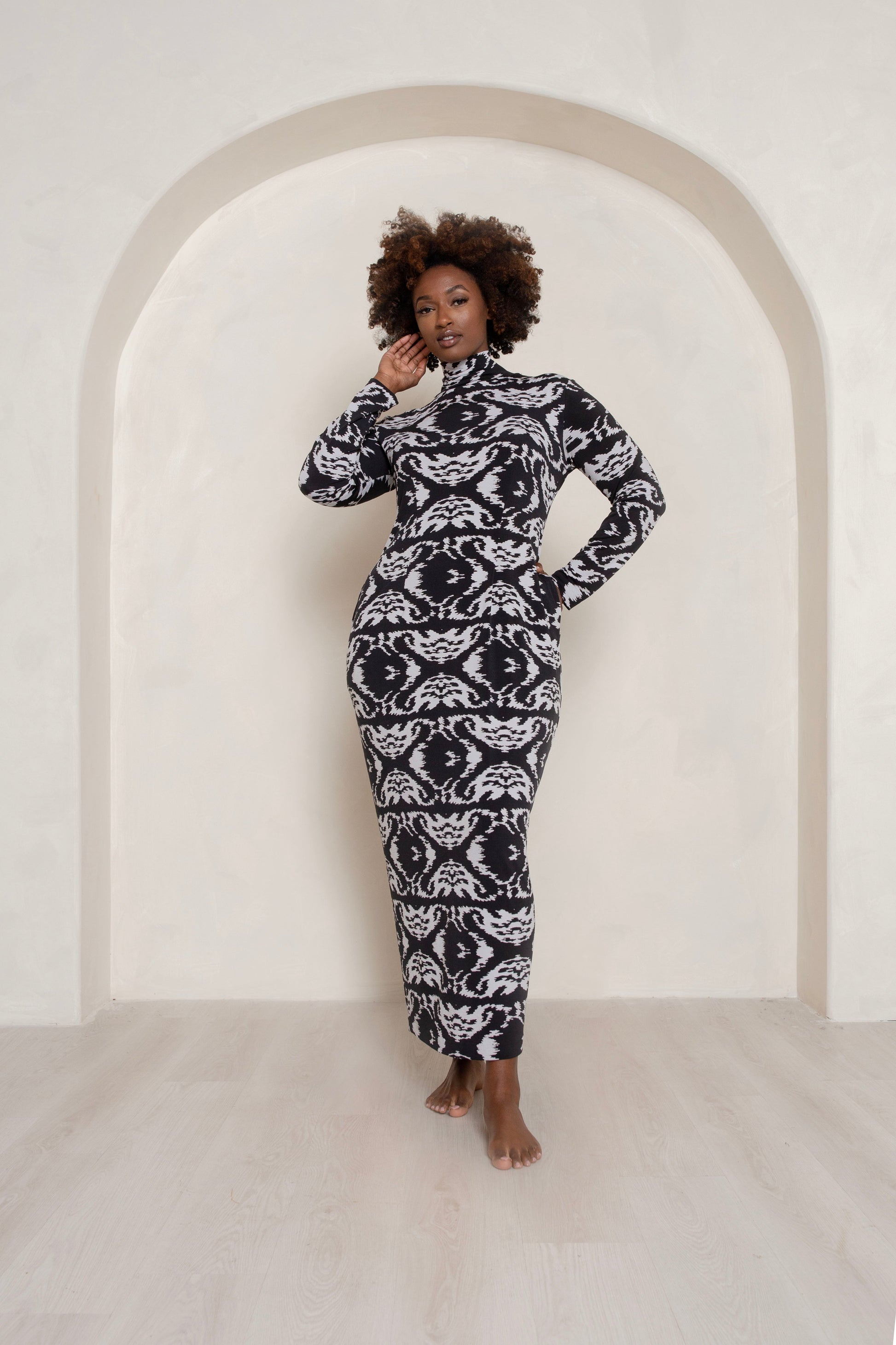 This long sleeve but lightweight cocoon dress casts a striking silhouette from its mock neck to ankle length. You can easily be dressed up or down; wear it on its own, or layer it under a jacket for an effortlessly chic look.