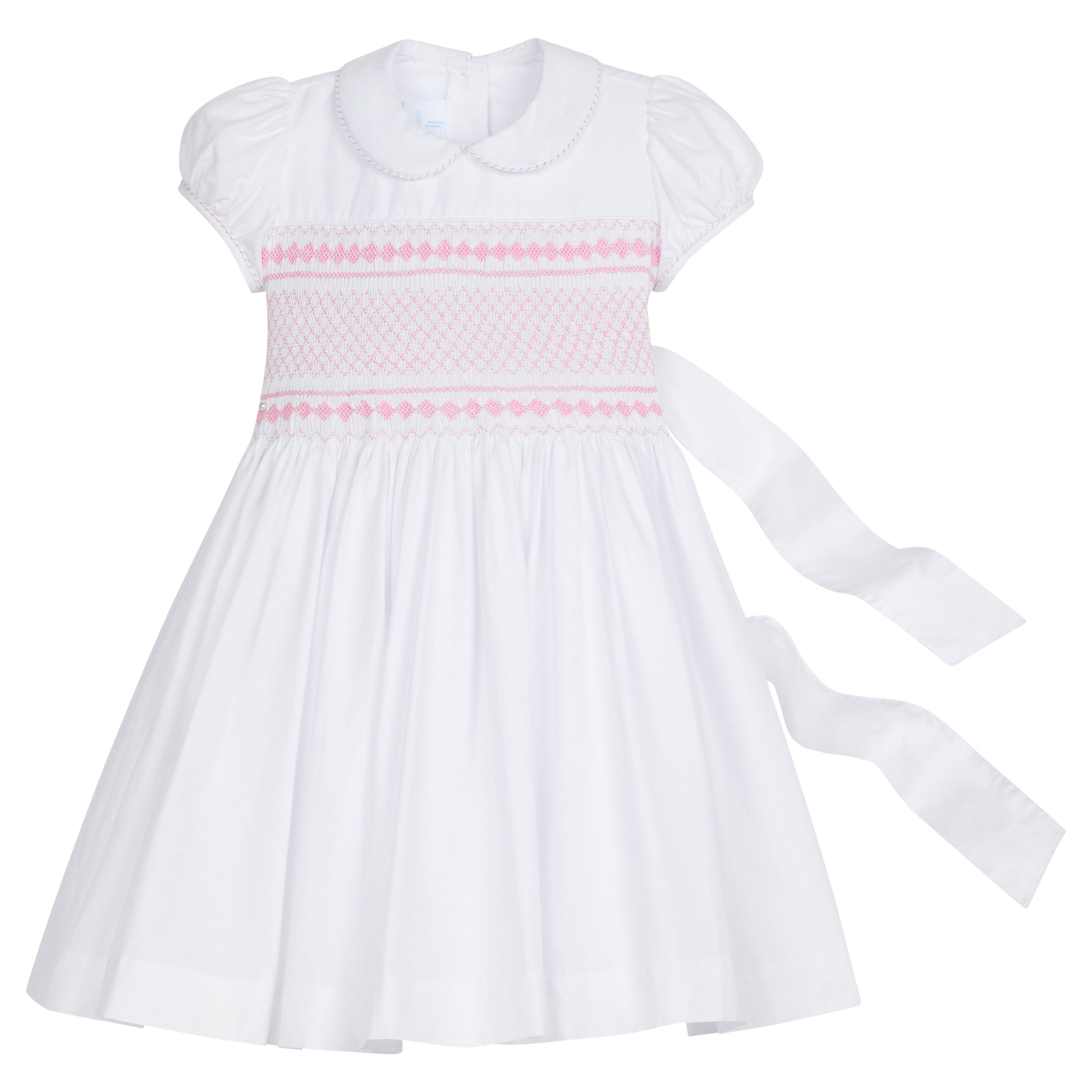 Meet the newest addition to our Special Occasion collection, the Smocked Emery Dress! This simple yet elegant dress features a peter pan collar, cap sleeves, and beautiful, deep smocking in light pink across the chest. Gathers under the smocking add extra volume to this precious silhouette and the tie sash in the back makes for the perfect fit. Your little girl will feel even more special on those extra special occasions.
