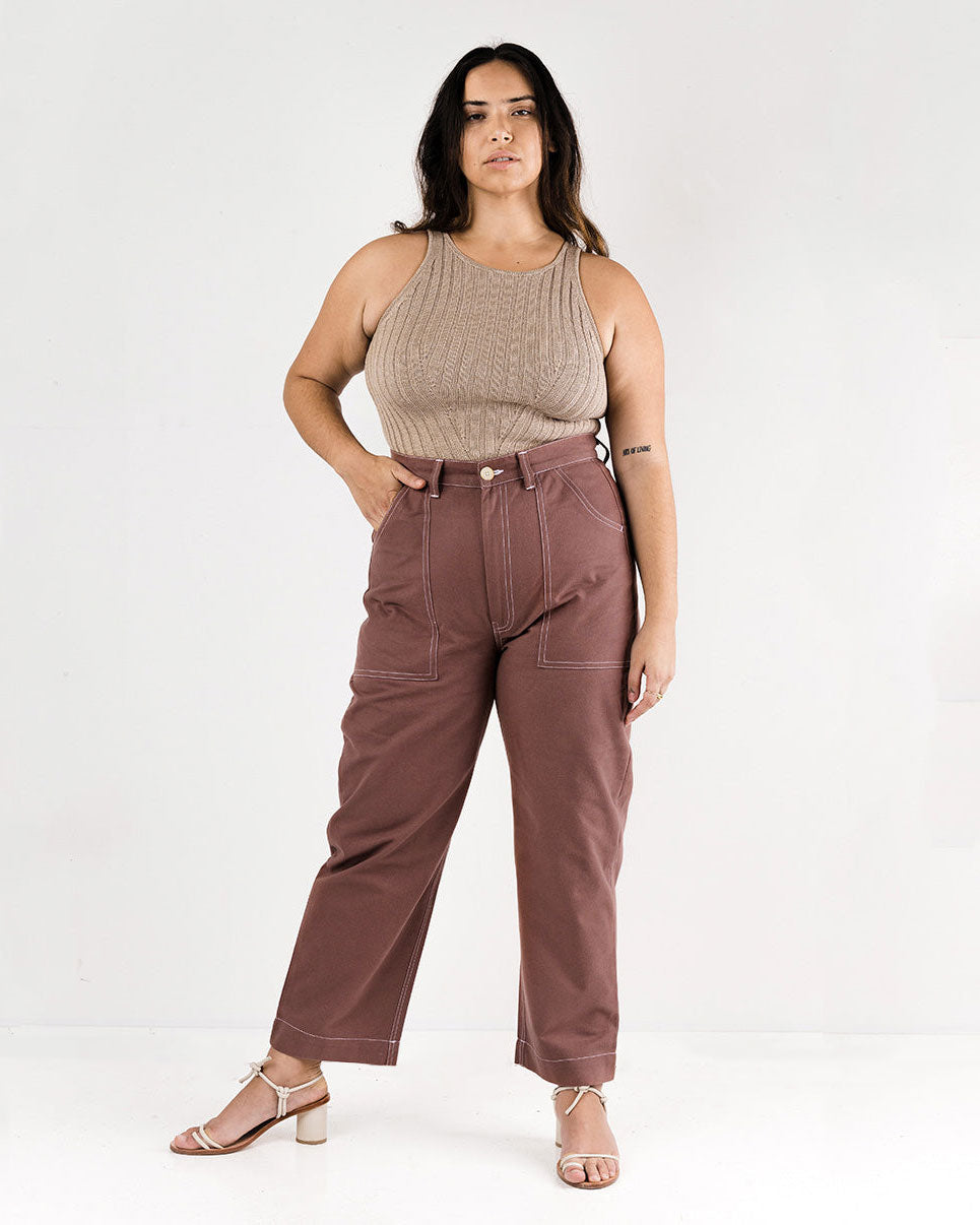 The organic cotton Clay Cargo Pants have a high coziness factor with their brushed fabric, ultra high waist and hugging hip fit. The fabric is a sturdy, medium weight that is up for life's daily activities while being super soft and easy to wear. The white contrast stitches add an extra detailed and elevated touch.