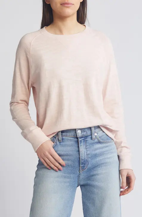 Our slub knit fabric is crafted from high-quality American-grown cotton, combed for exceptional texture and softness. The perfect layer does all the work of a sweatshirt — featuring a classic relaxed fit, knit ribbing at the collar, cuffs, and hem — without the added weight. Get one, and feel what we're talking about.