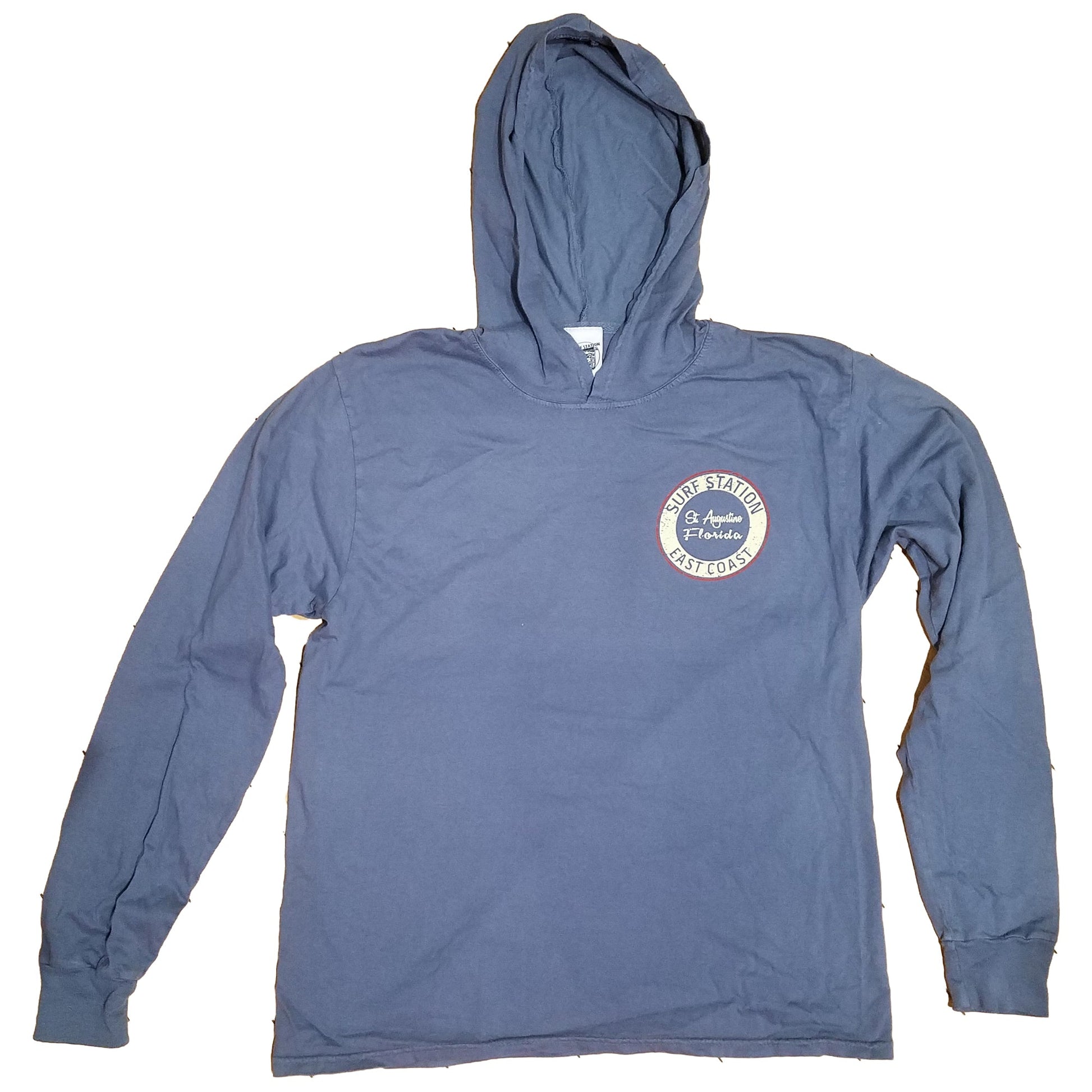 Represent the East Coast with Surf Station East Coast Men's L/S Hooded T-Shirt. Features a "Surf Station East Coast St. Augustine Florida" logo on front and back.