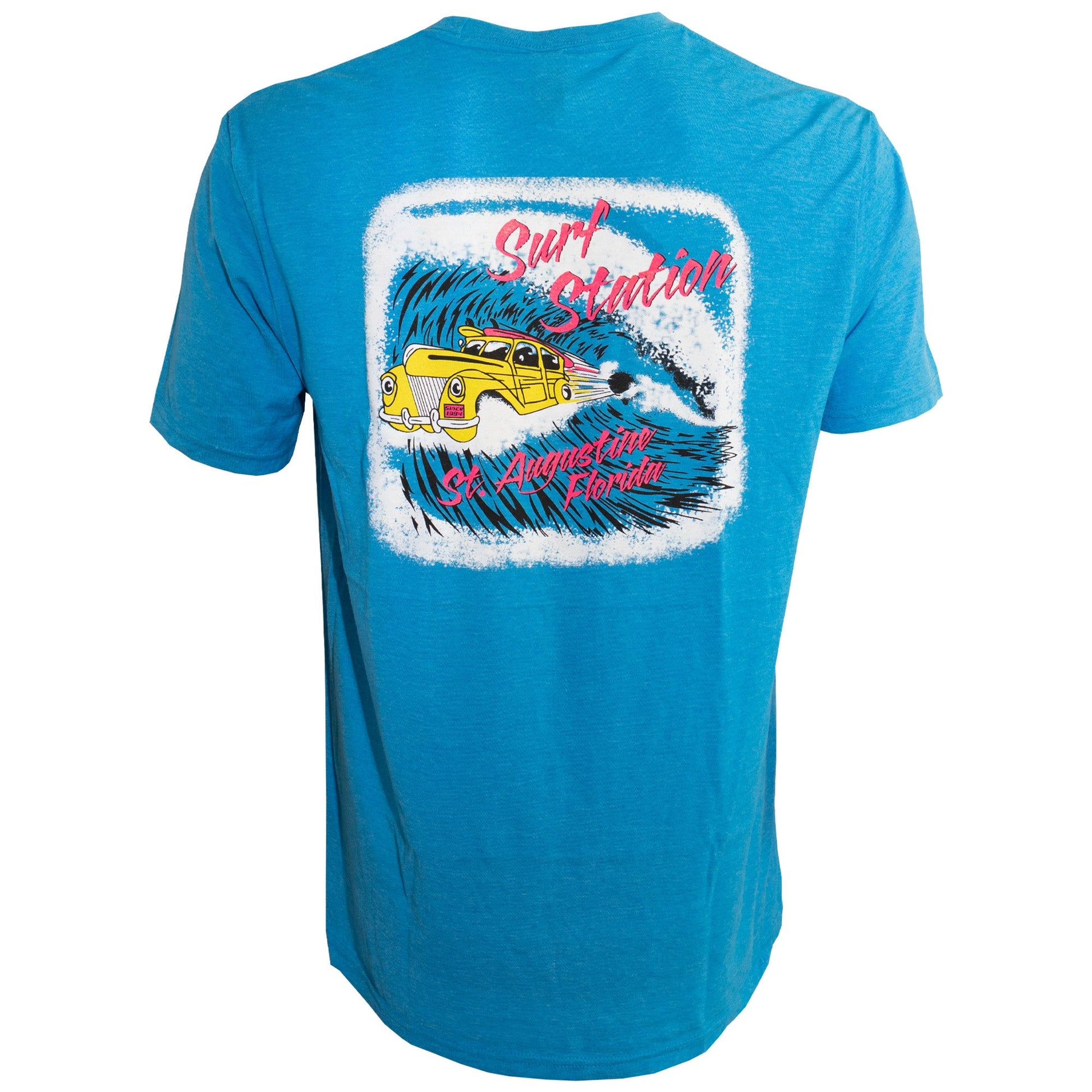 The Surf Station Shooting Barrel Men's Short Sleeve T-Shirt turns heads with a radical, 80's style neon design. Proudly made in the USA, this tee features a large design on the back and a small chest pocket placement Surf Station logo on the front. Features: • 50% Cotton/ 50% Polyester.