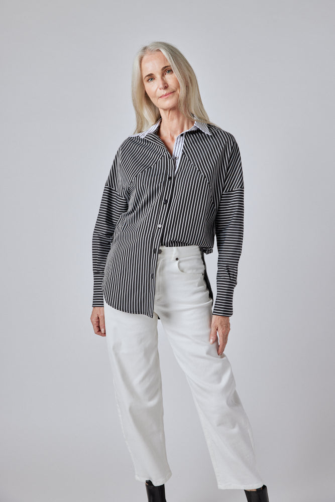 A new take on the classic button down. This blouse features an unexpected stripe pattern that is super flattering. Wear with the Classic Blazer for an edgy vibe
