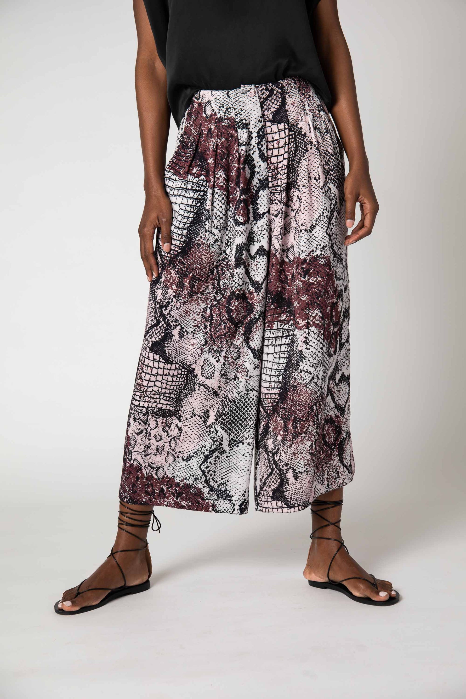 The Wide-Leg Culotte pants are taking the room by storm with their standout snakeskin design and super flattering wide-leg. Perfect for those beach strolls in the summer or classy dinner dates when paired with the All Day Washable Silk Top in black.