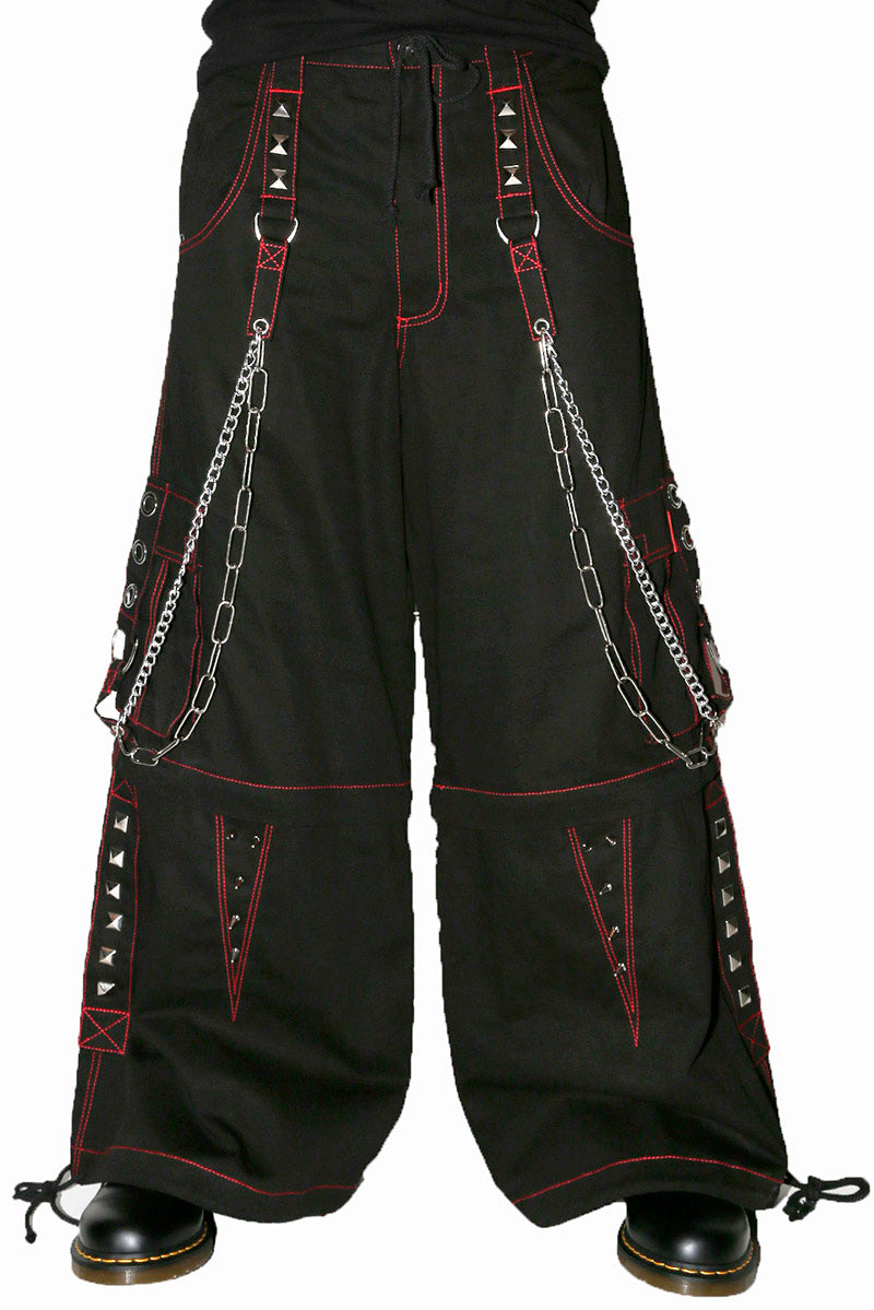 Shoot daggers in these black baggy street goth pants! Return to the shadows in the removable chains, adjustable ankles, and drawstring waist. When the sun sinks below the horizon, unleash your inner beast by zipping off the pant legs to transform these Tripp pants into shorts! Features blood-red accents, pyramid studs spikes, and deep deep pockets.