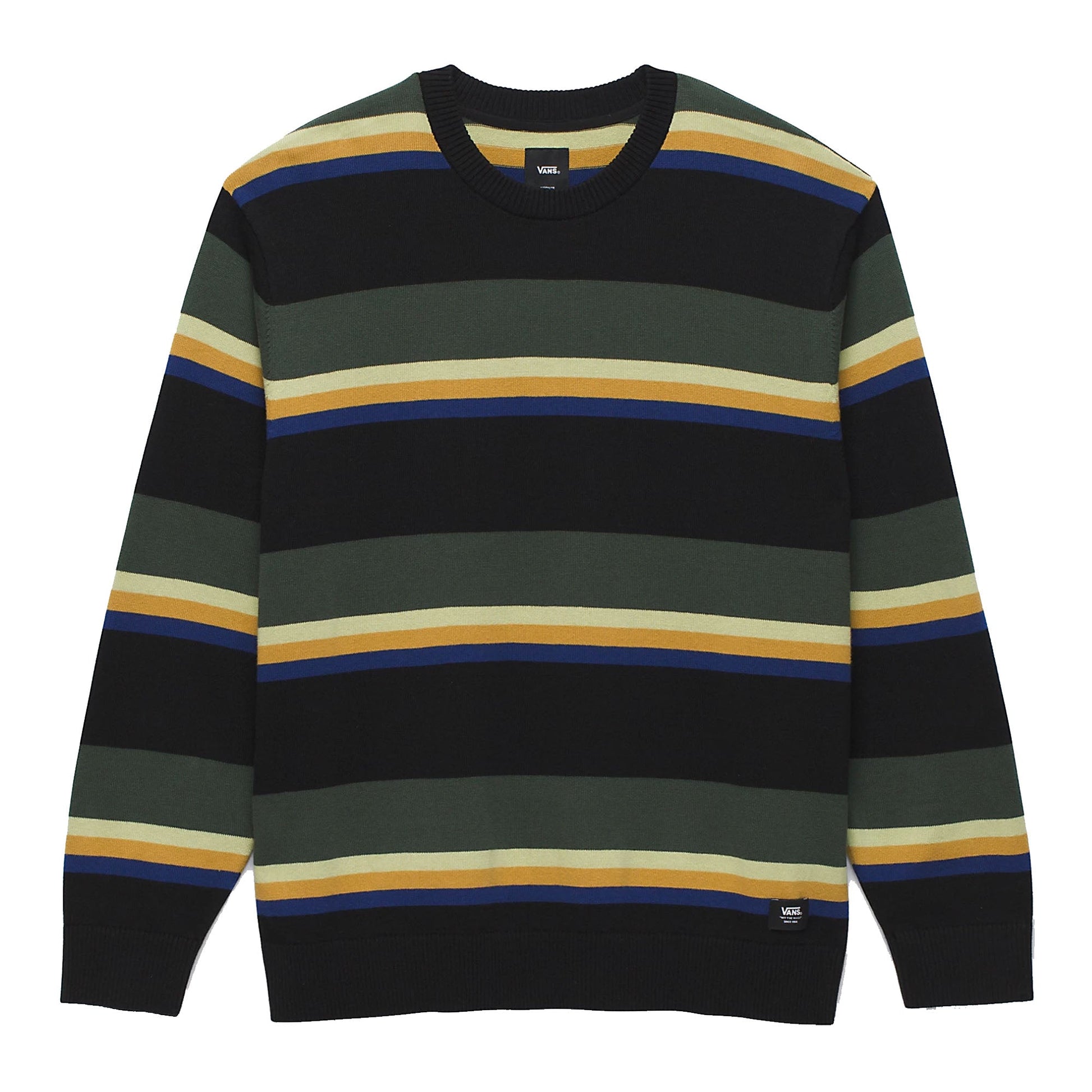 The Tacuba Stripe Crew Sweater is relaxed fit crewneck sweatshirt is made with a comfortable cotton-blend fleece, has ribbed hem and cuffs, yarn dyed striping patterns, and features the Vans flag label at the seam.
