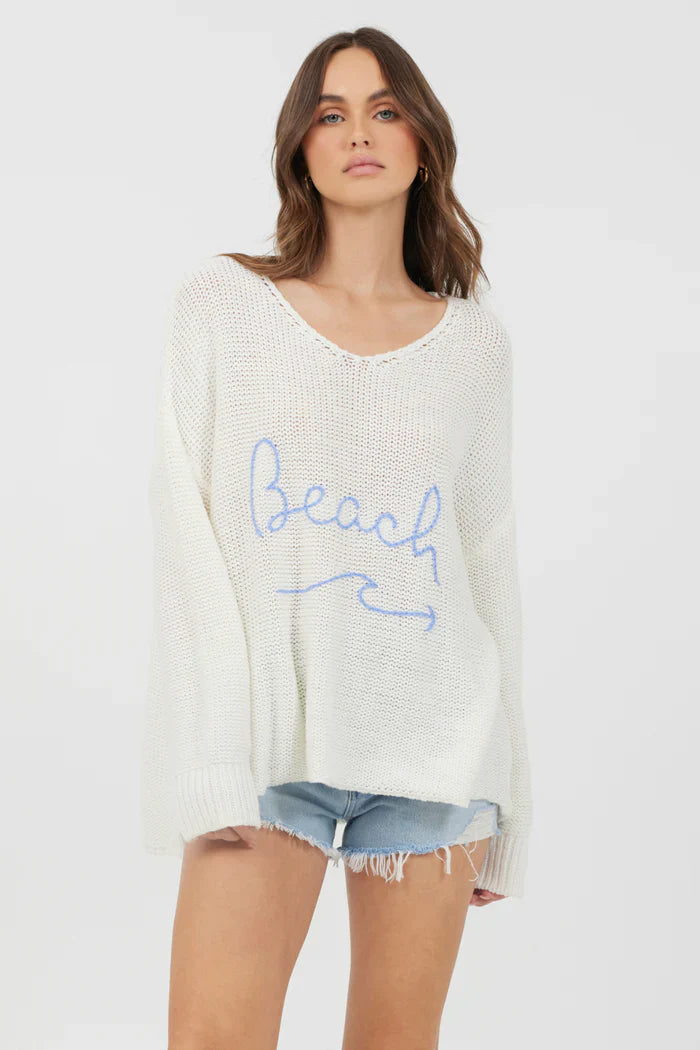 Introducing, the improved fabric of our Warm White "Beach" Sweater. Made with a cozy V-neck and oversized fit, this sweater is perfect for chilly beach nights. The blue "Beach" embroidery adds a touch of sophistication, making it a must-have for any luxury wardrobe.