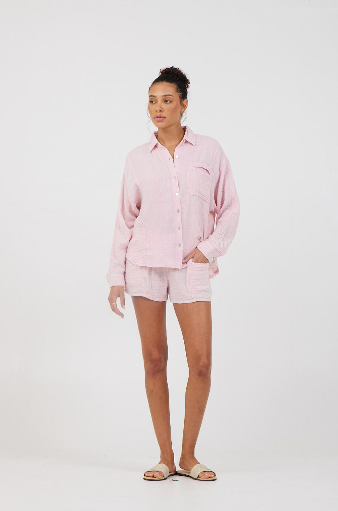 Introducing our Washed Gauze Button Up, a luxurious top crafted from lightweight and breathable gauze fabric. The washed finish adds a unique texture and depth to this classic button-up style. Perfect for a sophisticated and exclusive look that exudes elegance and refinement.