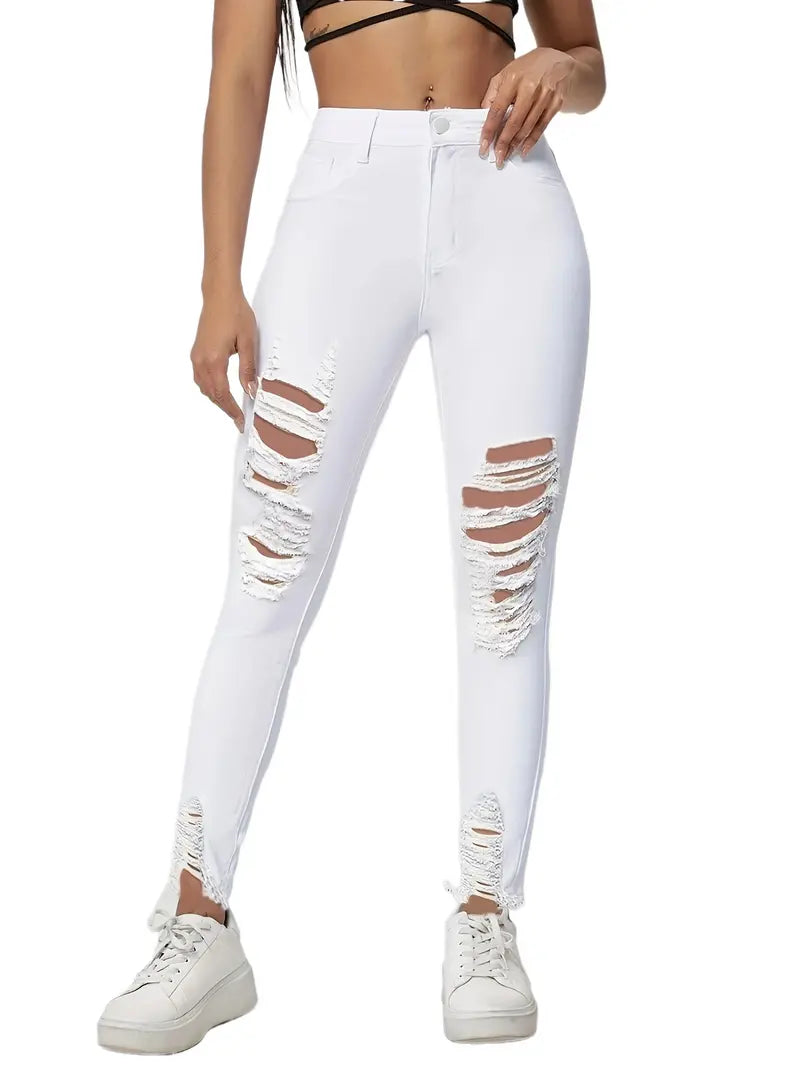 White Raw Hem Skinny Jeans, Ripped Slash Pockets Distressed Slight-Stretch Denim Pants, Women's Denim Jeans & Clothing